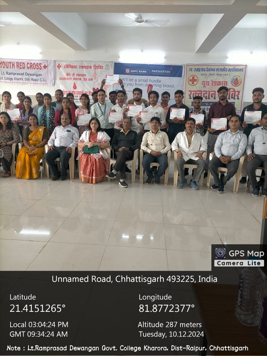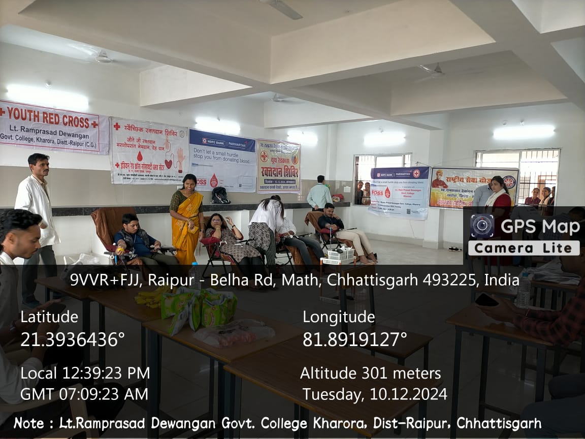 The Red Ribbon Club (RCC) of late Ramprasad Dewangan Govt. college Kharora organized a AIDS Awareness programme on10.12.2024 The programme was inaugurated by principal Dr. Shampa Chaubey and she has given Blood donation awareness speech, she also and explained about the benifits of blood donation.